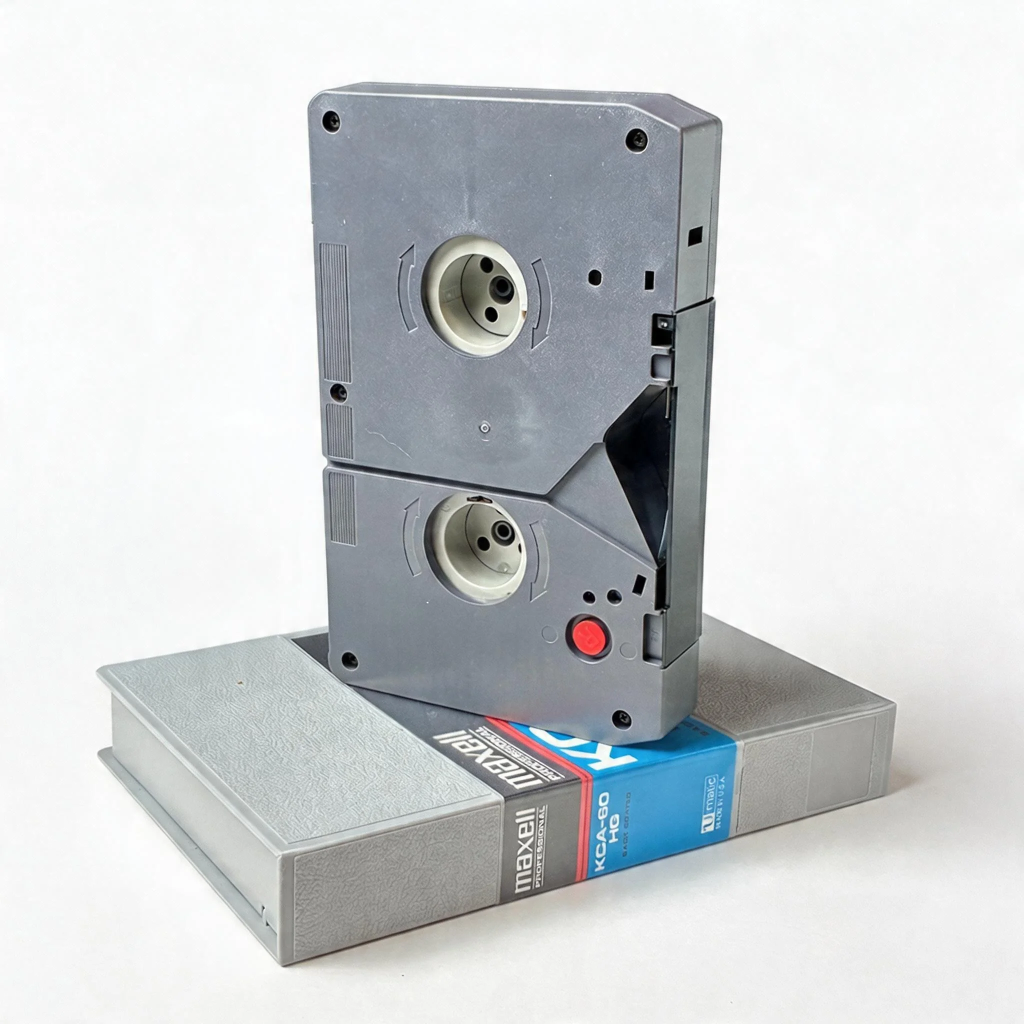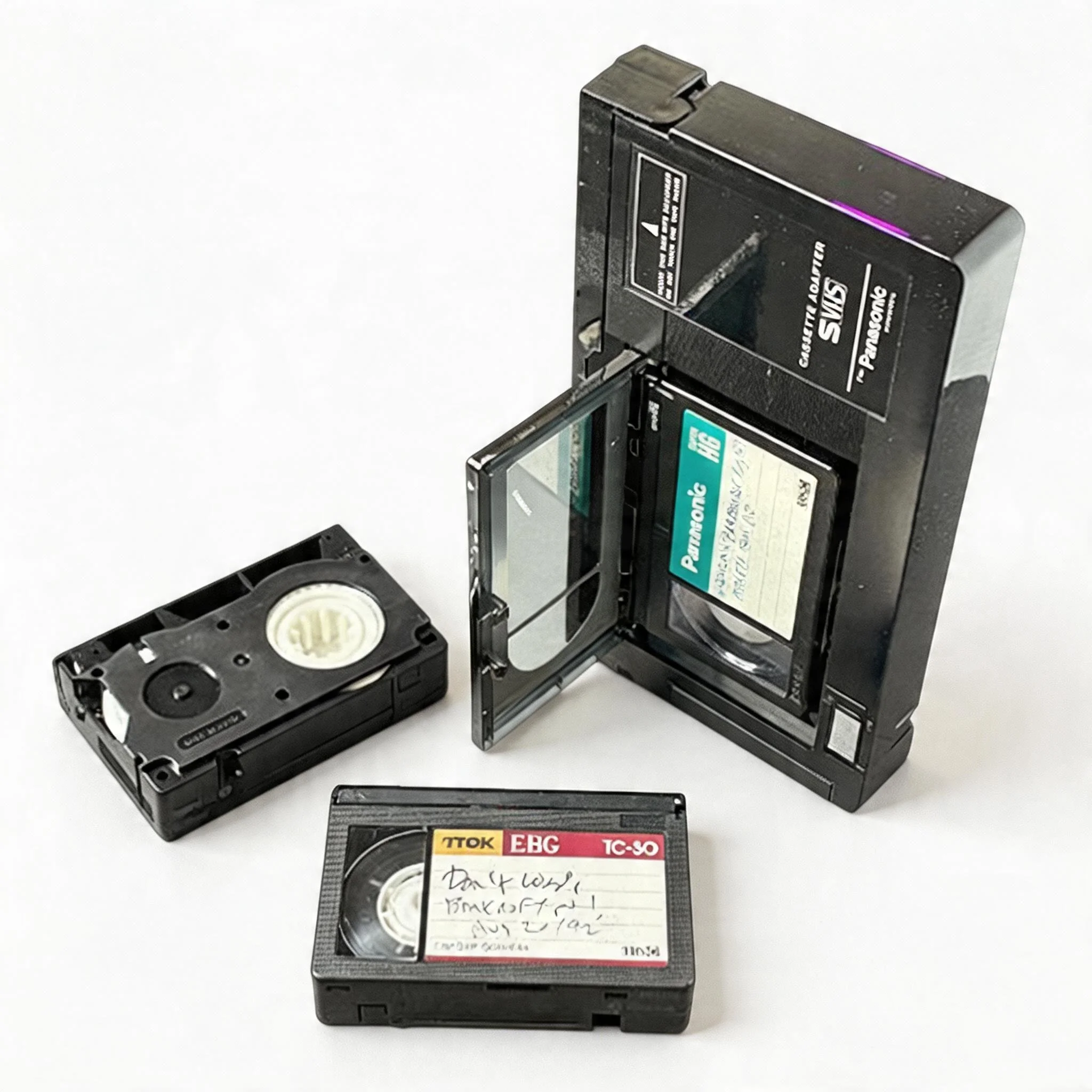 The compact cassette from '90s camcorders. Plays in a VHS deck with an adapter.