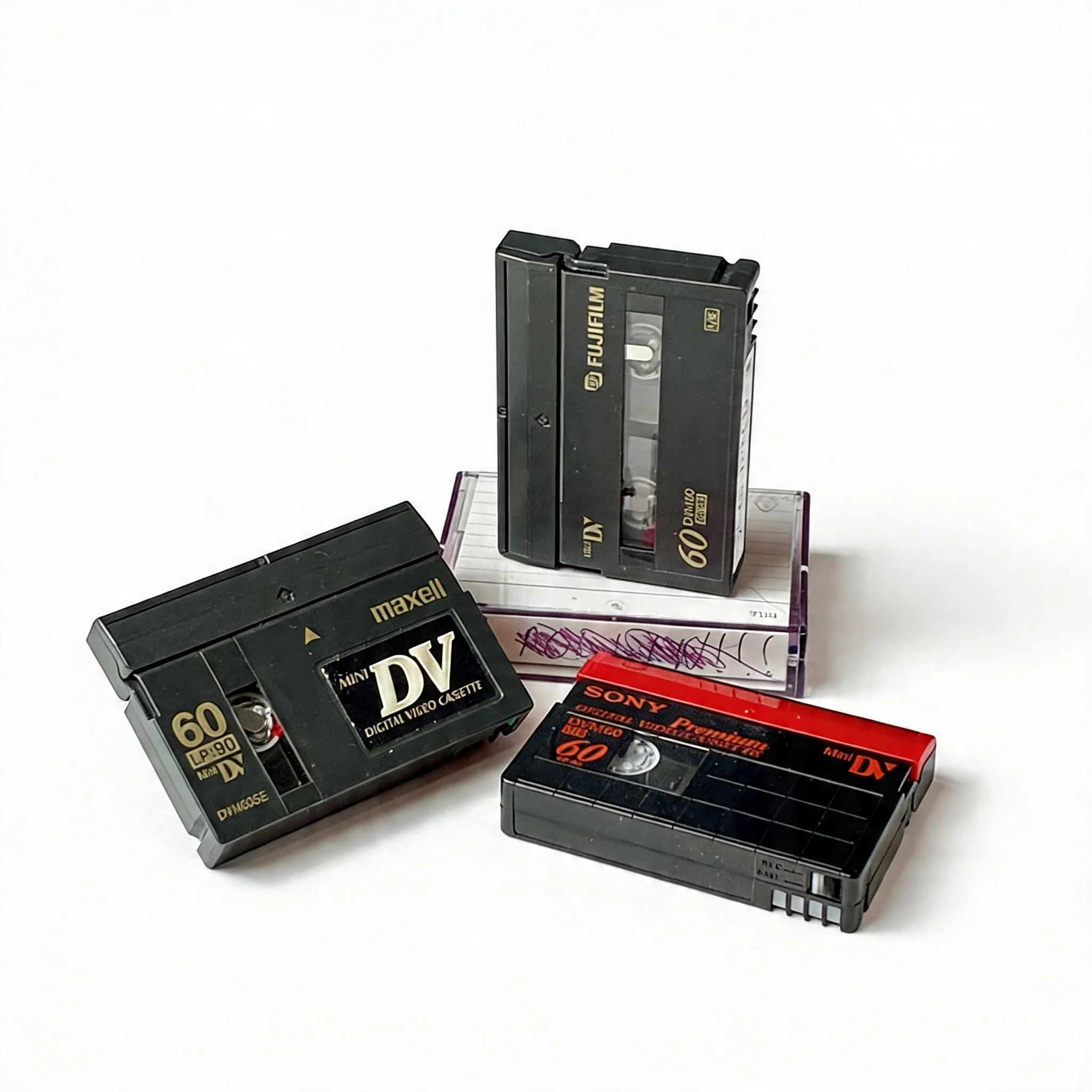 Small DV cassettes from early 2000s digital camcorders. High quality and fully recoverable.